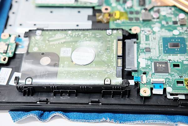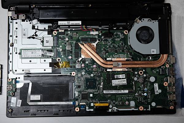 左上方有2組M2插槽, 最上面的是wifi 卡, 下方則是這機種的標配 128GB SSD M2卡. 2.5" 的硬碟槽位於左下方.